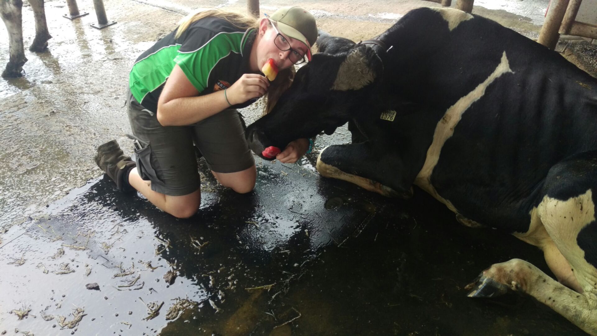 I was reluctant to 'put her down', although that appeared to be the only option, and the humane course of action. I spoke to Courtney, and asked her, along with Jason, and Justin (who literally started with us yesterday), to sit her up and give her one more opportunity to have a drink and a feed. What I didn't request was for Courtney to share her ICY POLE with Tarnya!! Justin was onto it (he'd been studying Veterinary Science and completed Animal Production prior to coming here) knowing the importance of re-hydrating her, but we had no electrolytes on hand.